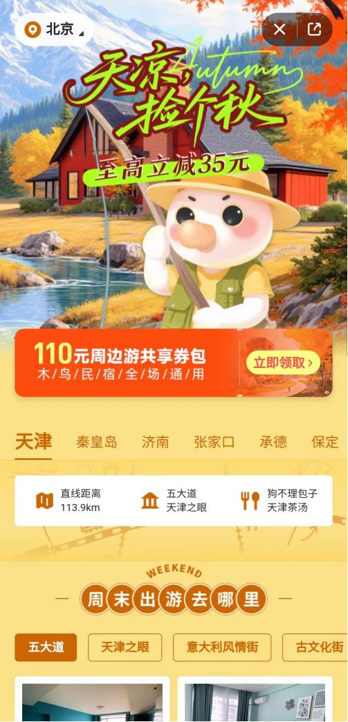 九月,木鸟民宿的活动仍围绕周边游主题展开,推出了“天凉捡个秋”专题,主要通过占据周末出游的用户心智、投放优惠券等方式促进订单转化。
