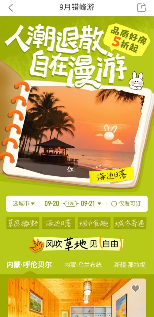 步入9月,进入了暑期和十一之间的相对淡季。尽管处于淡季,民宿预订平台并未停歇,木鸟、途家、美团纷纷推出新活动。从热门档期到非热门档期,平台间的竞争从未间断,这也反映出营销回归常态后平台打法的变化。在攻守博弈中,体现了民宿市场对全年订单的重视。