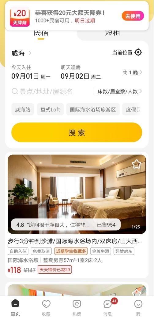 美团延续了天降券活动,用户登录即可领取20元天降券,在参加活动的房源下单时可抵扣,该券无门槛。但支持使用的全平台仅有1000 + 民宿,营销意义大于实际使用价值。