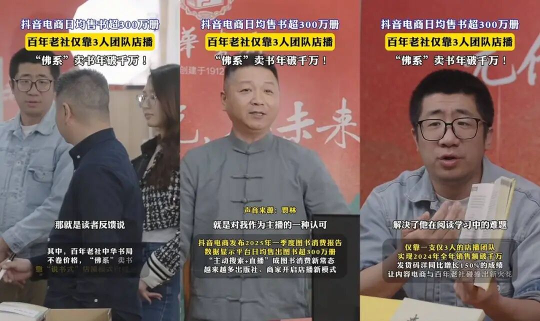 百年书社中华书局的负责人马晨与主播贾林、范明明组成直播团队,不搞低价恶俗促销,而是靠对书籍的深入解读和真诚分享,吸引了大量爱书、惜书的读者,把直播间变成了小型“文化课堂”。这种不急于卖货,先传递价值的“佛系说书式”慢直播,实现了口碑和销量双丰收,2024年中华书局直播间书籍销售额破千万。