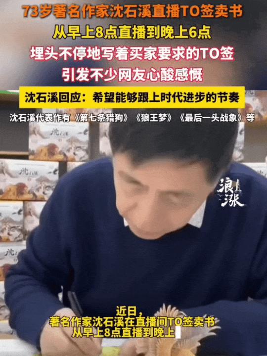 73岁著有《狼王梦》的作家沈石溪,直播时通过TO签(指带有“To某某”个性化签名)卖书,从早上8点一直播到晚上6点,一直埋头书写买家要求的TO签。直播中,他还认真查看弹幕并回复,一句“希望能够跟上时代进步的节奏”,让大众感到心酸。
