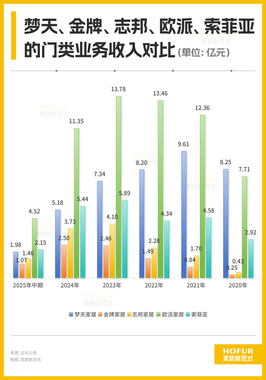 家居新范式认为,主要原因是各大家居企业纷纷跨界进入木门赛道,抢占了梦天家居的市场份额。2021年以来,欧派家居、金牌家居、志邦家居、索菲亚等新兴玩家在木门市场快速发展。2020年,欧派家居的木门业务收入低于梦天家居,2021年就实现了大幅反超,2024年木门业务收入是梦天家居的两倍;索菲亚的木门业务同样发展迅猛,2024年收入正式超越梦天家居;金牌家居和志邦家居的木门业务也保持着增长态势。
