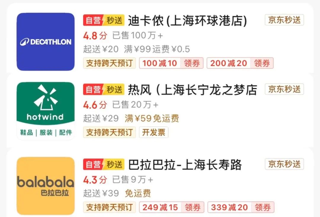 运动品牌入驻外卖平台带来了一定增量。今年京东心动购物季期间,秒送业务里运动鞋服品类成交额同比激增250%;美团闪购6月份的运动鞋服类目成交额、客单价同比大幅提升;淘宝闪购称,7月份有395个非餐品牌商家月成交突破百万,迪卡侬是成交前五品牌之一。