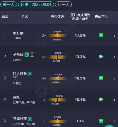 另一方面,新剧表现普遍平淡,没有突破之作。暑期档尾声古偶扎堆的情况延续到了9月,但市场表现没有明显改善。奇幻题材的《十二封信》、迷雾剧场的《目之所及》等新剧播出效果不佳,《生万物》至今仍稳居云合日榜榜首。