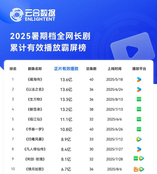 从市场反馈来看,现实题材是“长板”。《生万物》《以法之名》稳居热度榜前二,《扫毒风暴》《利剑·玫瑰》也进入暑期档长剧累计有效播放量排行榜前十,现实主义题材迎来了一波崛起。但烂尾、注水、不及预期等问题也客观存在,导致未能出现全民爆款剧。