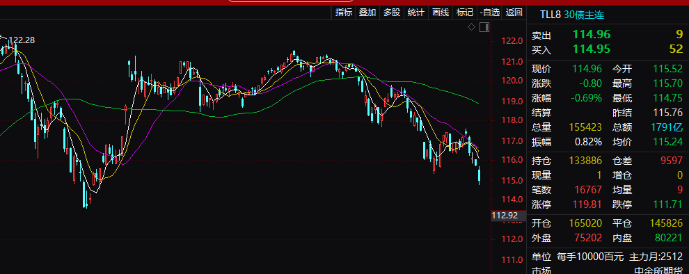 9月10日,国债迎来一轮下跌。午后,国债期货跌幅持续扩大,30年期主力合约一度大跌0.82%报114.81元,创3月24日以来新低。银行间30年期国债收益率上行逾2BP,创该债券上市以来新高。10年期国债活跃券收益率亦于午后加速上行1.5BP报1.81%,时隔五个月重回1.8%上方。