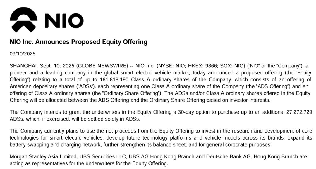 9月10日,蔚来宣布,拟进行一项涉及合共最多1.82亿股公司A类普通股的发行(股权发行),该发行包括美国存托股份(ADS)的发售(每份代表公司一股A类普通股,ADS发行)和A类普通股的发售(普通股发行)。股权发行中发行的ADS和/或A类普通股将根据投资者兴趣在ADS发行和普通股发行之间进行分配。