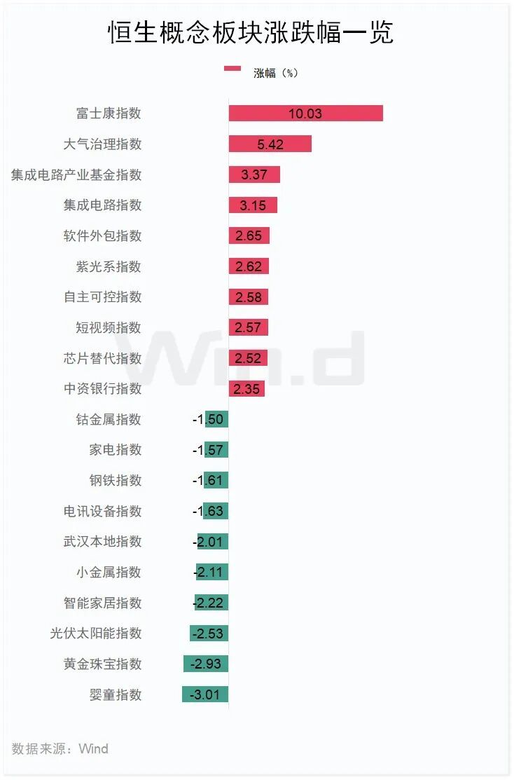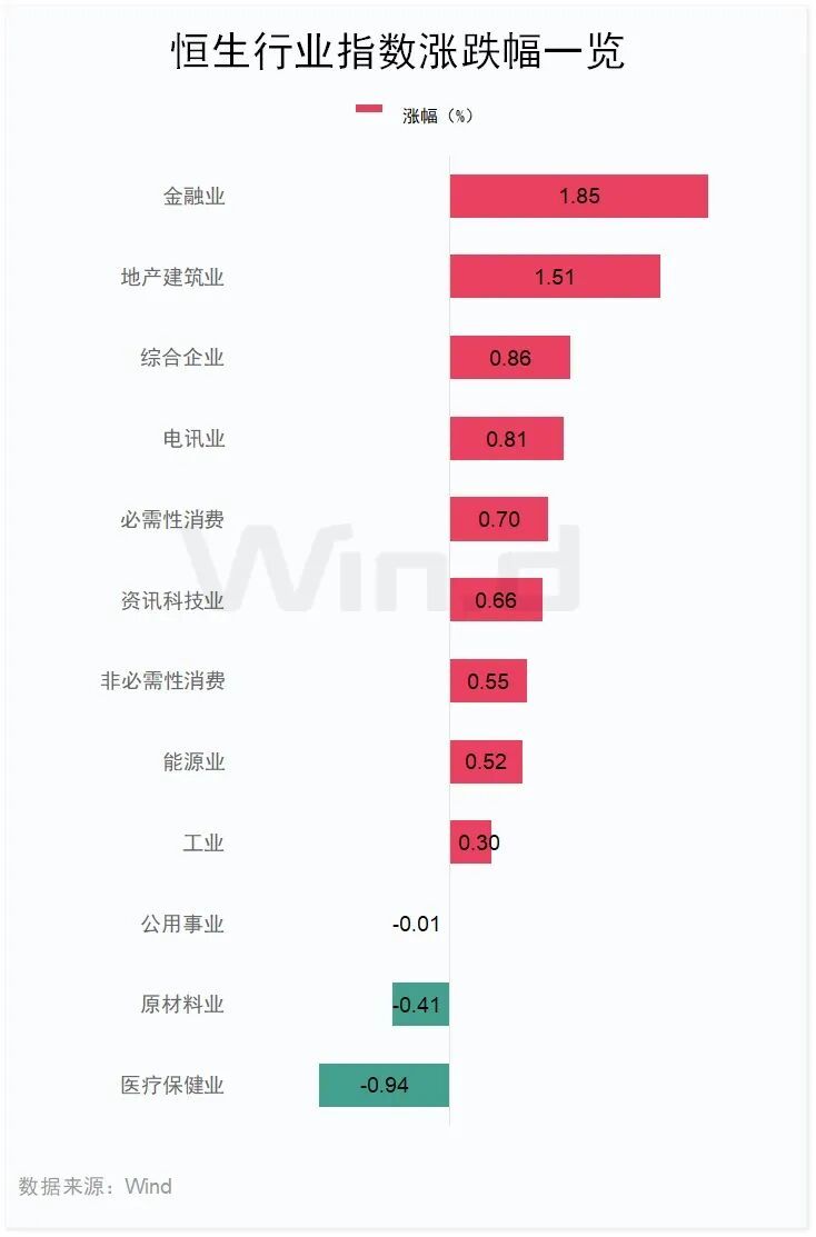 行业表现上,恒生行业指数中,金融业指数上涨1.85%,地产建筑业指数上涨1.51%,综合企业指数上涨0.86%。跌幅方面,医疗保健业指数下跌0.94%,原材料业指数下跌0.41%。