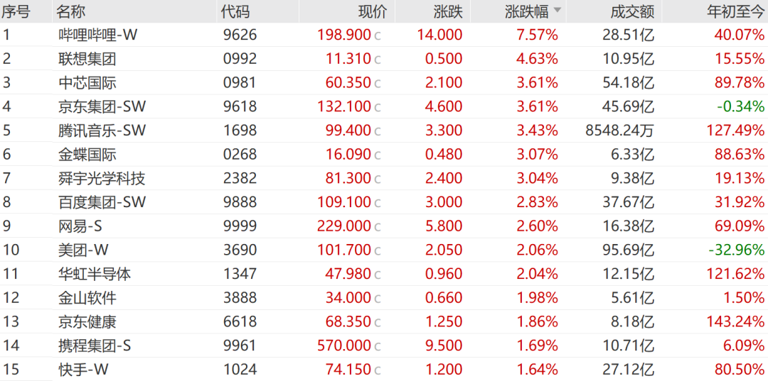 恒生科技指数成份股中,20只上涨,9只下跌。哔哩哔哩涨7.57%,联想集团涨4.63%,中芯国际涨3.61%,领涨恒生科技指数成份股。