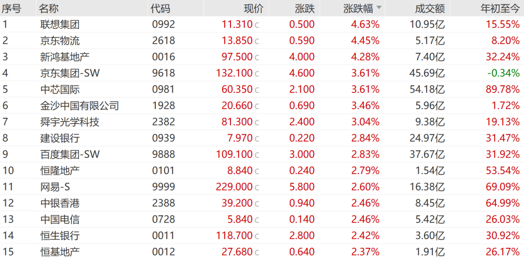 在恒生指数成份股里,65只上涨,21只下跌。联想集团涨4.63%,京东物流涨4.45%,新鸿基地产涨4.28%,领涨蓝筹。