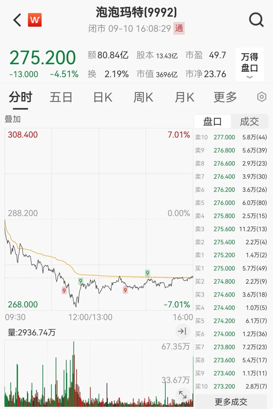 9月10日,因有媒体报道LABUBU系列二手价格正全线下跌,泡泡玛特开盘即大幅下跌,最高跌幅达7.01%,随后跌幅收窄,全天收于275.20港元/股,跌4.51%,领跌蓝筹。不过年初至今,泡泡玛特股价涨幅达208.24%。