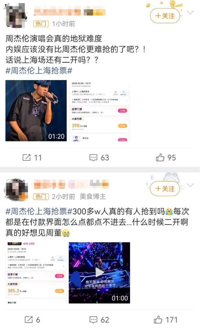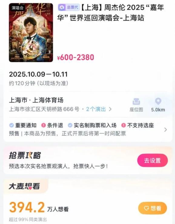 9月8日19:00,周杰伦2025“嘉年华”世界巡回演唱会上海站开启抢票。该演唱会将于10月9日、10日、11日晚19点在上海体育场连演三天。