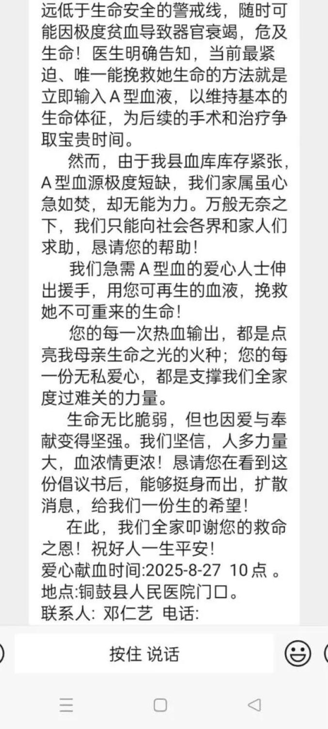 主治医生表示:“当前最紧迫且唯一能挽救她生命的方法,是输入患者所需的A型血液,维持基本生命体征,为后续手术和治疗争取时间。”然而,由于血库A型血源不足,患者的儿子邓仁艺手指带着颤抖,一字一句敲下求助信息,转到一个个群里。