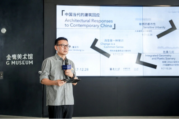 ■《中国当代的建筑回应》展览现场,胜景几何设计研究中心李兴钢致辞。
