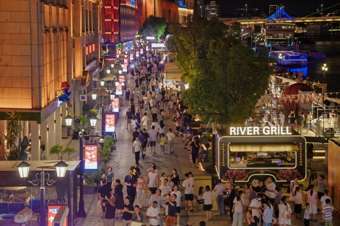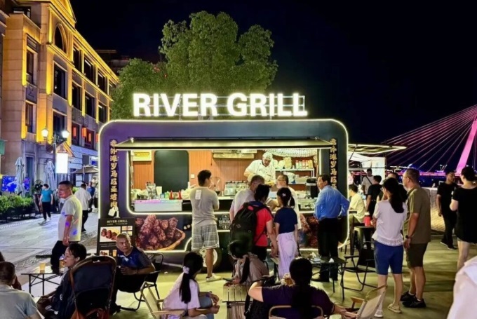 当轻柔的晚风吹过三江口,夜幕笼罩下的老外滩,灯火逐渐璀璨起来。在那霓虹闪烁、音乐悠扬的街头,一辆挂着“RIVER GRILL”招牌的餐车旁,飘出阵阵诱人的炙烤香气。这里是罗马尼亚餐车主理人Duiu Onofrei的美食小站,也成了近期老外滩备受关注的国际化美食新地标。