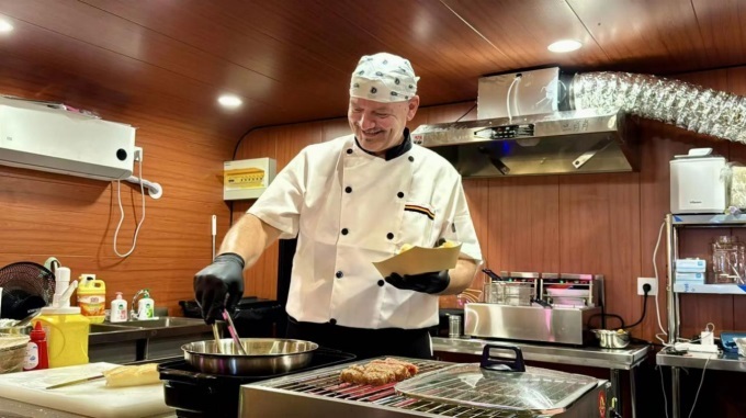 “你好!欢迎光临!”Duiu用带着异域口音但热情满满的中文迎接来往的客人。他头戴厨师帽,手戴烹饪手套,熟练地翻动着烤架上的肉肠和面包。那滋滋作响的烤肉声,还有浓郁的烟熏香气,一下子就把食客们的感官带到了多瑙河畔的东欧街头。