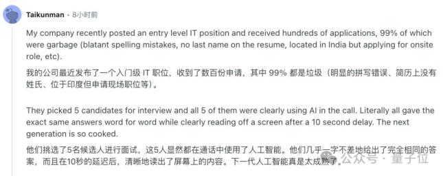这种就业市场让各方都苦不堪言。有人吐槽公司收到上百份申请,99%都是垃圾,而且申请人面试时还在用AI对话,给出几乎完全相同的答案。还有HR表示,对那些AI生成的、千篇一律的简历感到厌烦,认为这类简历非常不走心,很容易被刷掉。