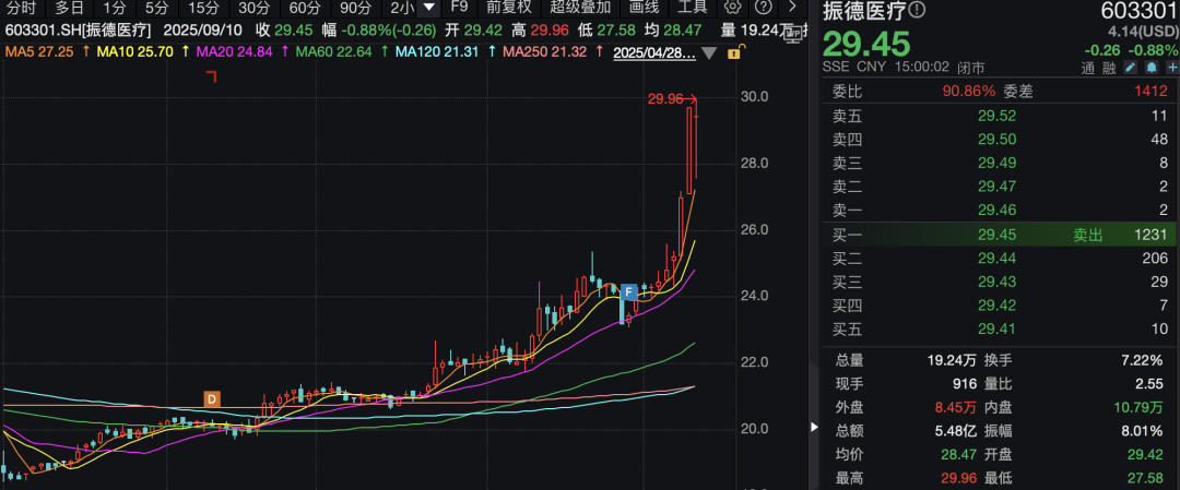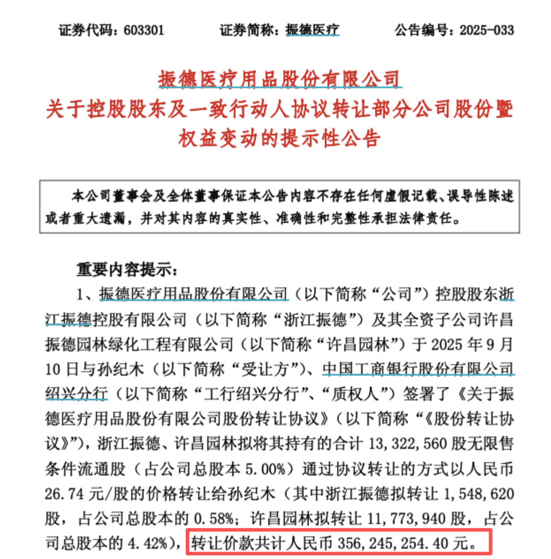 协议转让股份的价格是26.74元/股,以振德医疗9月10日收盘价29.45元/股来估算,折价约10%,对应的转让价款共计3.56亿元。