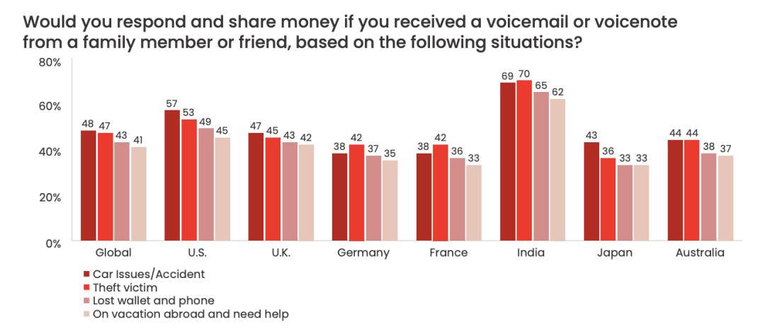 调查还揭示,45%的诈骗是假冒朋友或家人发来语音消息,请求来自伴侣或配偶(40%)、母亲(24%)或孩子(20%)。消息内容包括车祸(48%)、遭受抢劫(47%)、丢了手机或钱包(43%)和出国旅行时的意外(41%)。
