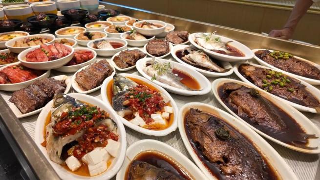 不到中午11点,位于普陀区兰溪路与南石二路交叉口的煌泰泰·兰溪社区食堂就热闹起来了。荠菜芋艿、糟溜鱼片、咕咾肉等七八十种菜品在选菜区一字排开,让不少顾客看得眼花缭乱。近期天气炎热,食堂还特意推出冬瓜炒肉、清炒秋葵等时令菜,并且免费提供大麦茶和绿豆汤,给顾客在高温天带来一丝清凉。