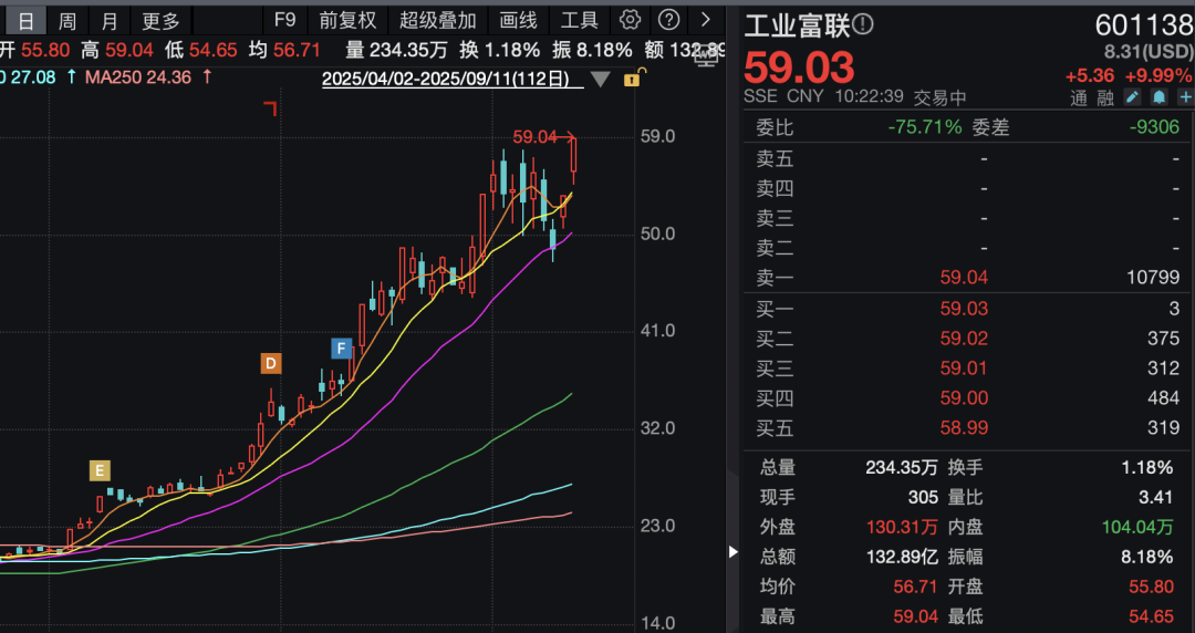 个股方面,工业富联涨停,实现两连板,最新总市值为11725亿元。