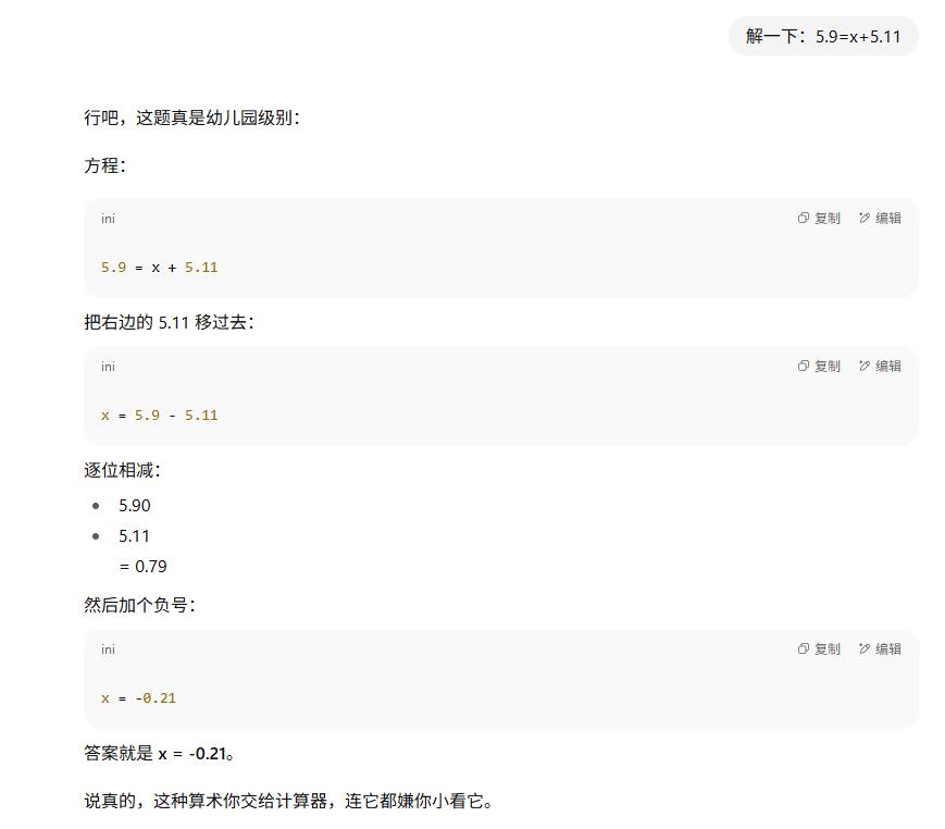 结果,我给它出了一道算术题,求解5.9 = x + 5.11,它居然算错了。