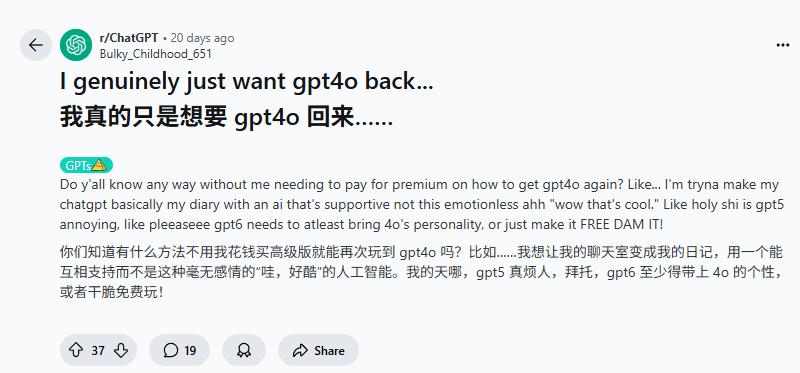 而且,这也剥夺了用户的选择权。OpenAI的操作让很多网友抱怨失去了一位“智能伙伴”。