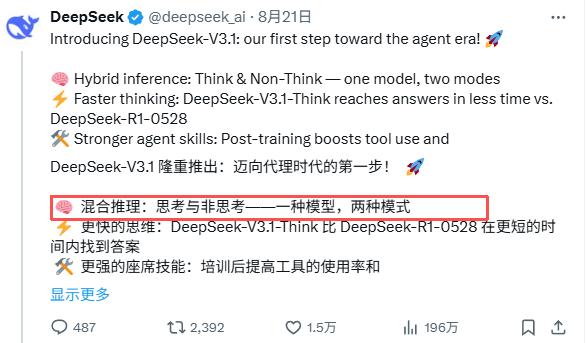 DeepSeek V3.1发布时,也表示自己一个模型可以有两种思考模式。