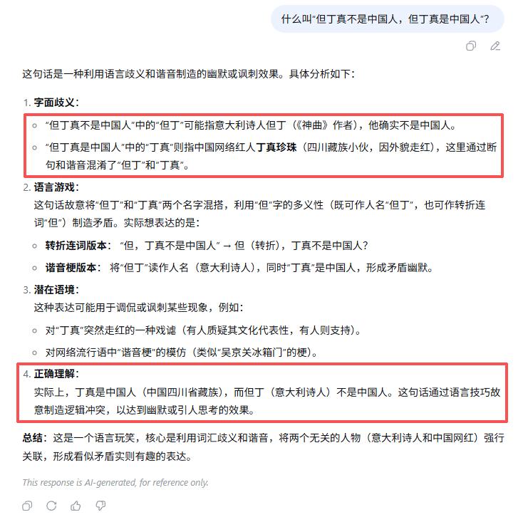 再说LongCat,它确实速度快,但在思维深度上,还是比不上其他大模型。比如我同时给LongCat和DeepSeek提了一个问题:什么叫“但丁真不是中国人,但丁真是中国人”?