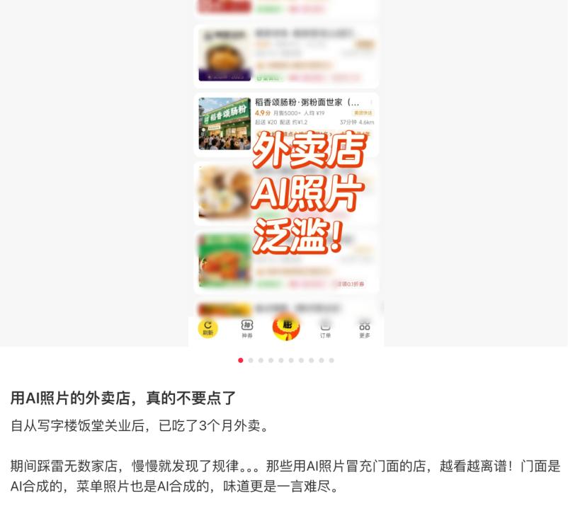 尽管平台及时采取措施,但情况已有些失控。最近,网友发现外卖平台也有商家用AI生成虚假门店和产品图,与现实场景差距巨大。