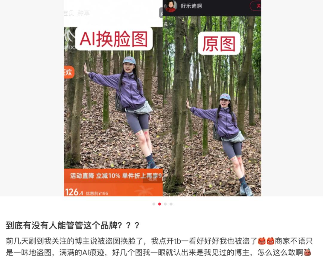 从去年起,淘宝等电商平台出现部分用AI换脸或AI生图技术生成产品展示图的商家,评论区也有明显的AI图片。从买家秀到卖家秀,从卖家到买家,AI技术引发的内容“照片”风暴形成闭环,不断挑战品牌和消费者的信任底线。