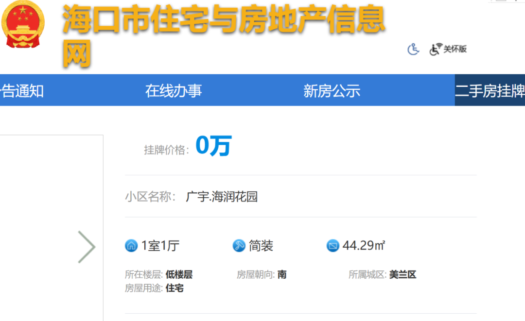 近期,海口市住宅与房地产信息网的“二手房挂牌”页面出现诸多异常房源信息,如92.68平方米房源挂牌售价零元,102.27平方米房源售价100元,142.82平方米房源200元,还有84.48平方米房源售价1750万元等。这些“零元房”“100元房”“200元房”及“天价房”,并非出现在房产中介网站,而是出现在相关部门主办的房地产类官方网站。