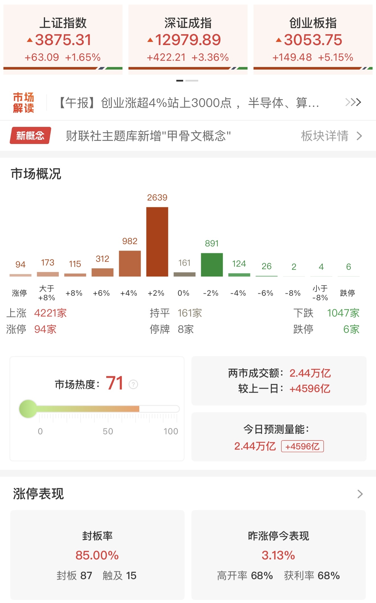 沪深两市成交金额达2.44万亿元,相较于上一交易日增加了4596亿元。收盘时,沪指涨幅为1.65%,深成指涨幅为3.36%,创业板指涨幅高达5.15%。