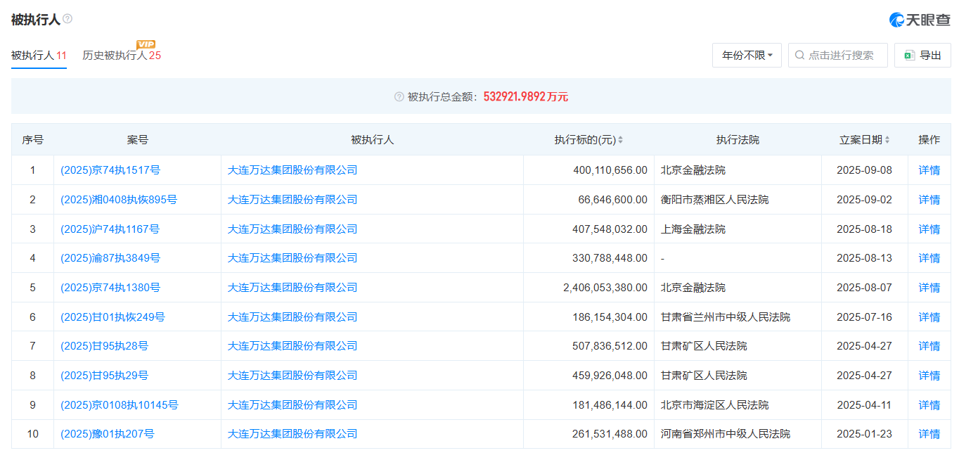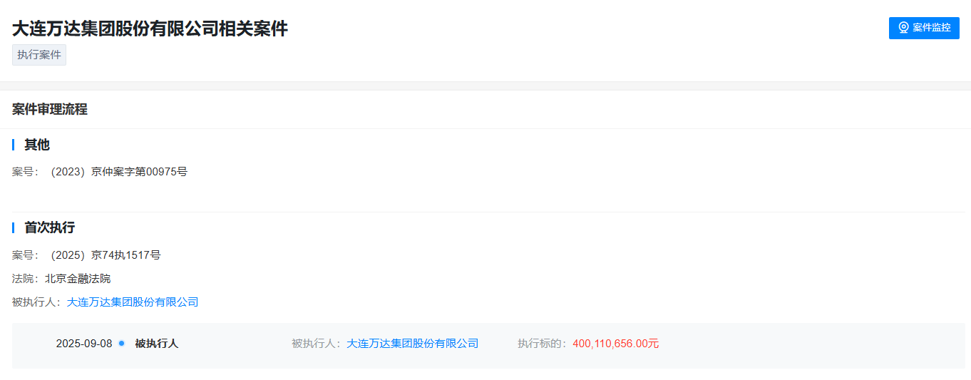 财联社9月11日消息,天眼查数据显示,近日,大连万达集团股份有限公司新增一条被执行人信息,执行标的达4亿余元,执行法院为北京金融法院。