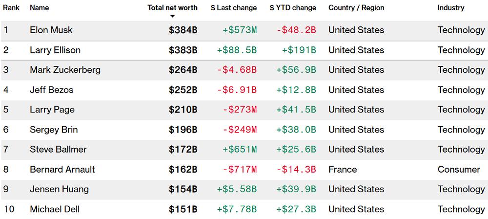 巨额合同的曝光,让甲骨文创始人兼董事长Larry Ellison的个人财富增加了近900亿美元,当天一度逼近4000亿美元,超过马斯克的3830亿美元,成为世界首富。不过彭博社亿万富豪指数的最新数据显示,目前Ellison的资产总额有所回落,是世界上第二富有的人。