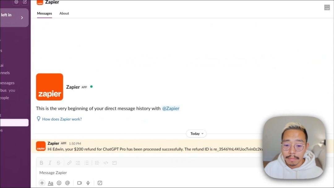 接下来,Demo演示了退款:为刚刚订阅的ChatGPT Pro进行退款操作,并给出通知。