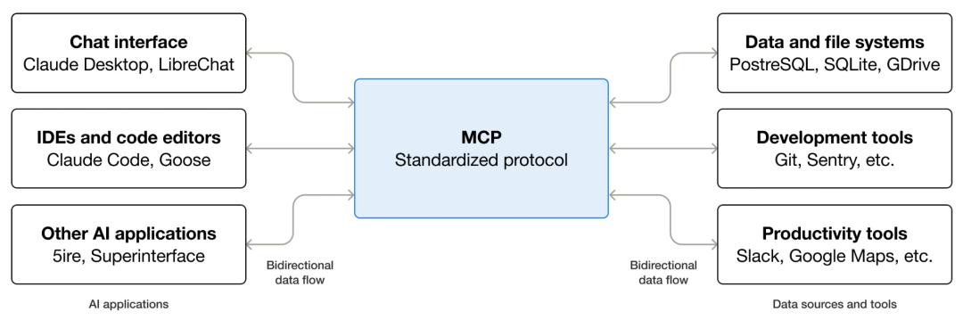 可能很多人不清楚什么是MCP,这里简单解释一下。MCP全称是Model Context Protocol,中文名是模型上下文协议。它是一种让AI模型、工具(API)、数据源之间进行标准化交互的协议。
