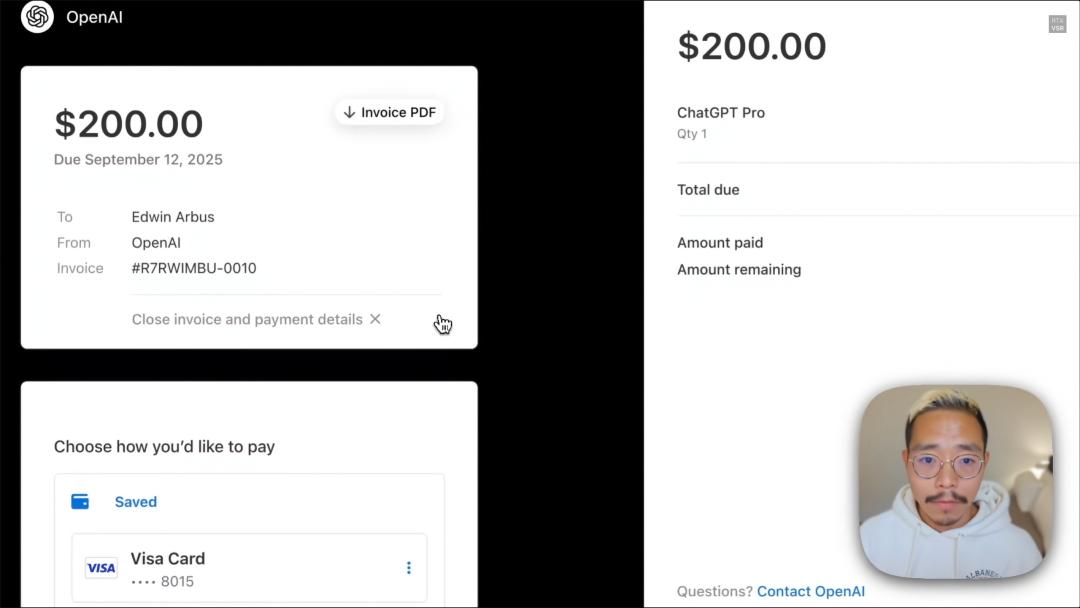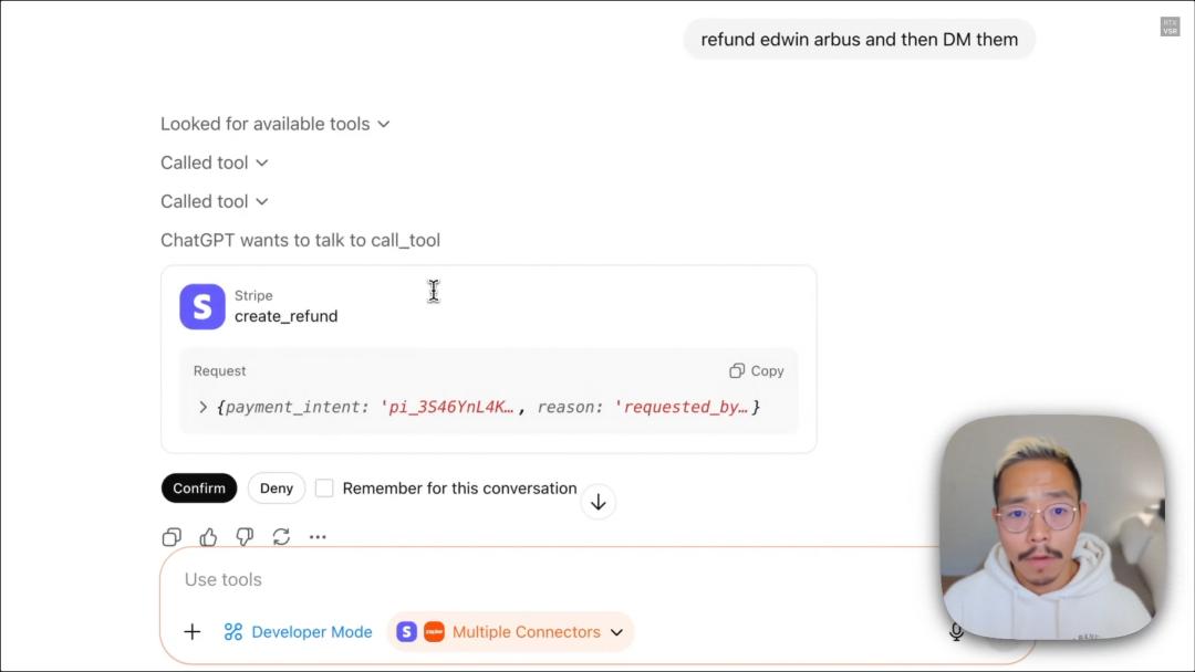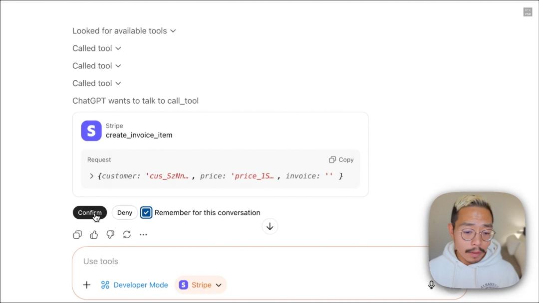 下一步,Demo中的OpenAI员工Edwin Arbus给出Prompt:收取ChatGPT Pro费用并开发票。类似这种涉及金钱交易的敏感操作,OpenAI设立了安全闸,需要二次确认。也可以选择在本次对话中,对已询问过的同一敏感数据的授权不再弹窗确认。
