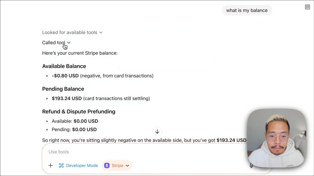 当然也可以直接掏出手机打开Stripe看余额,但Demo是为了展示,ChatGPT已能获取Stripe个人账户中的数据,并可用于其他复杂环节。