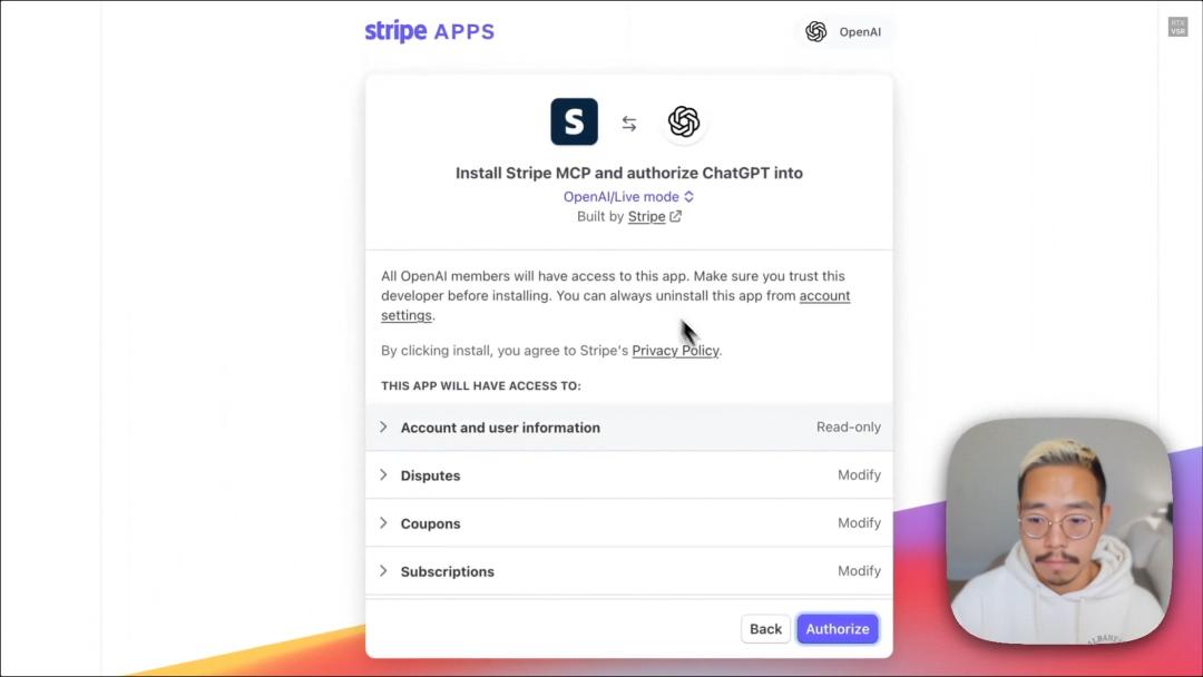 在示例中,需要Stripe(类似支付宝的国外流行App)为OpenAI授权相关权限。
