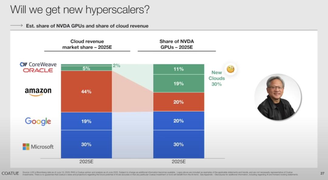 根据Coatue的数据,2025年云收入份额里,三巨头加起来高达93%。可在英伟达GPU的采购份额里,他们只拿走70%。反而是Oracle、CoreWeave这些新玩家,收入份额不足7%,却买走了30%的GPU。