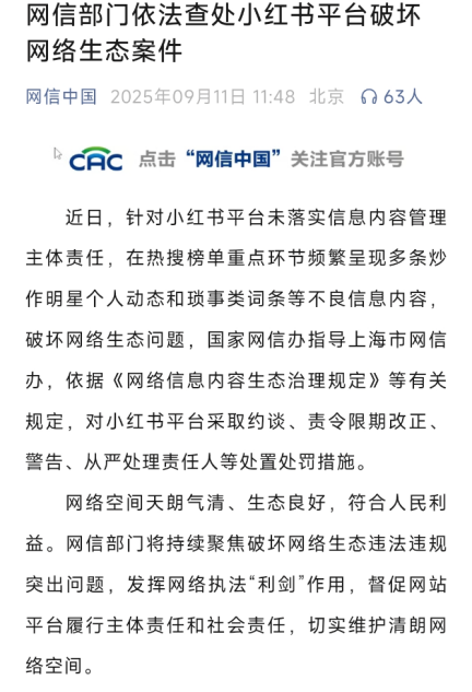 据“网信中国”微信公众号消息,小红书因热搜榜单频繁炒作明星动态、破坏网络生态,被上海市网信办依法采取约谈、警告等处置。