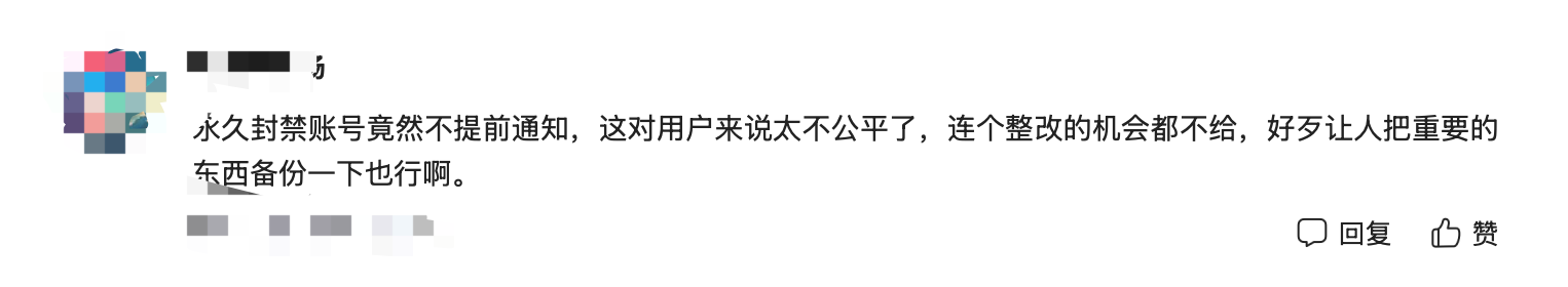亦有网友“喊冤”称:“永久封禁账号竟然不提前通知,这对用户来说太不公平了,连个整改的机会都不给,好歹让人把重要的东西备份一下也行。”