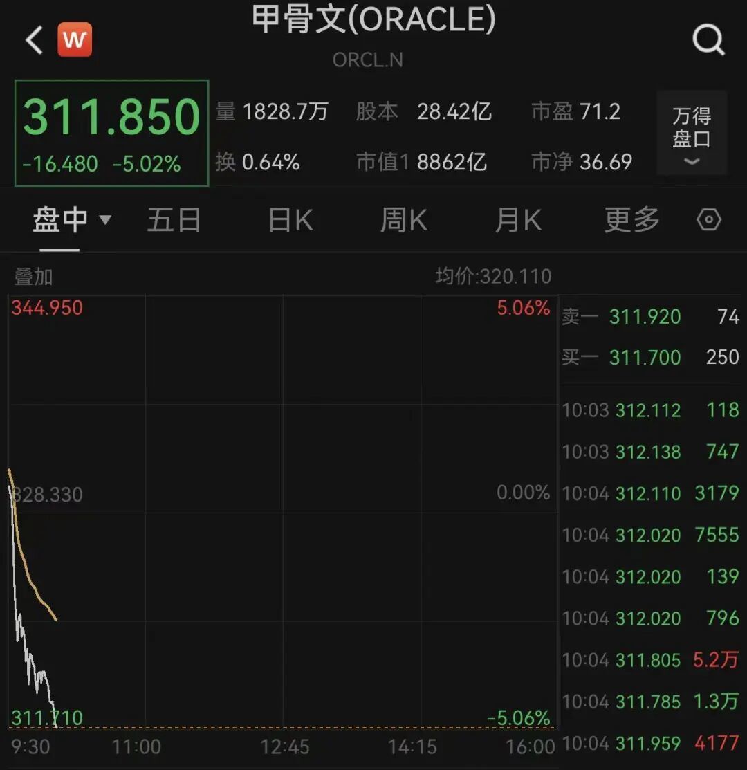 甲骨文盘中跌幅超5%,不过其股价昨日大涨36%,日内市值暴增约2500亿美元。