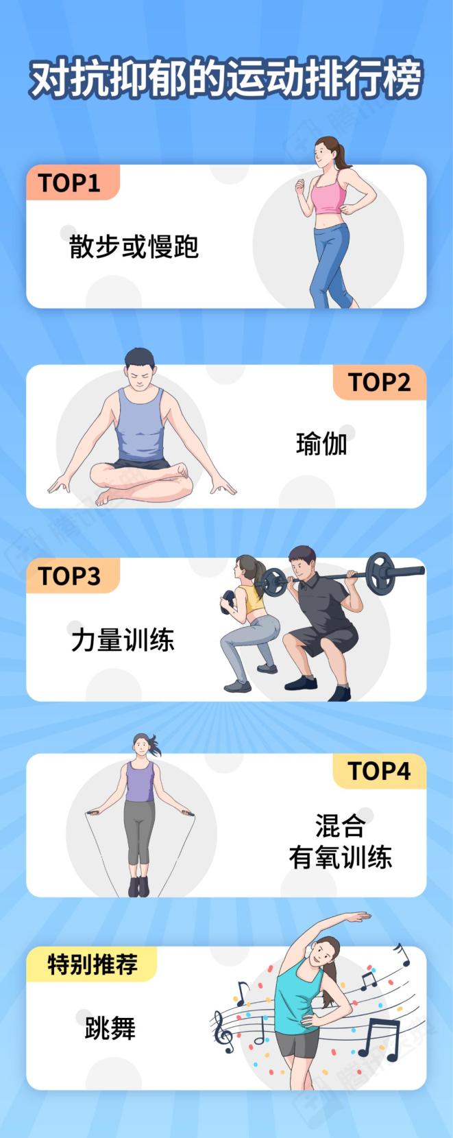 在对比分析了不同运动类型与其他常见的抑郁治疗方式(如药物治疗、心理疗法等)后,评选出了对抗抑郁效果较好的几种运动。