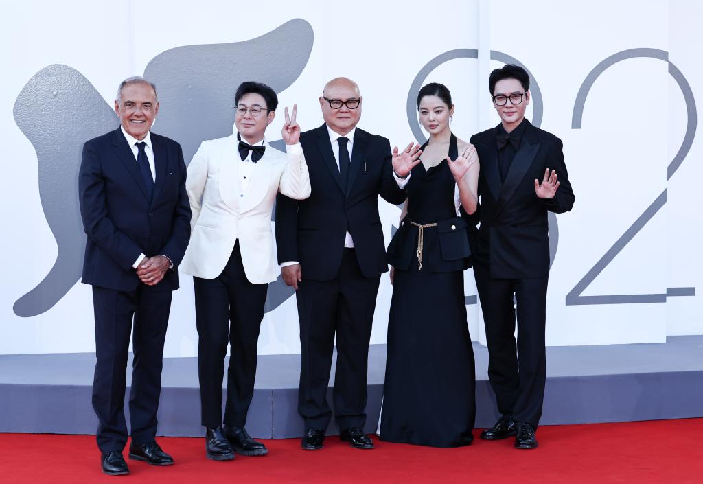 9月5日,在意大利威尼斯,电影《日掛中天》主创人员与威尼斯电影节主席阿尔贝托·巴尔贝拉(左一)出席首映式。新华社记者 李京 摄