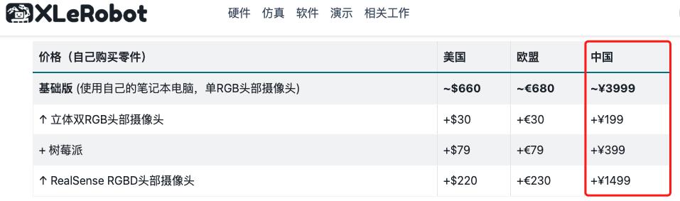 而且XLeRobot采用模块化设计,核心硬件官方也列了清单,有全向轮、桌夹、树莓派、宜家推车、开源机械臂等等。你还能根据需求调整部件,比如把RGB摄像头换成全景视野版本,所以价格是3999元起。