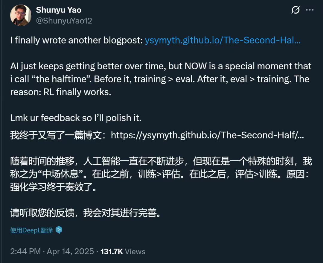 今年4月,姚顺雨发表博客文章《The Second Half》,提出“AI下半场”的概念,被广泛视为AI研究范式转折的标志性论述,其核心理论是AI领域正从“训练更强的模型”转向“定义和评估真正有用的任务”。