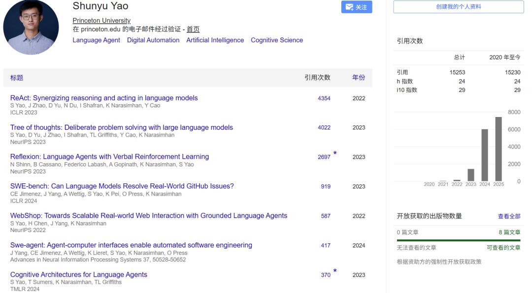 此外,他还参与构建了著名软件工程基准SWE - Bench和模拟电子商务网站环境WebShop,推动了AI智能体的发展。截至目前,姚顺雨的论文总引用量超1.5万。