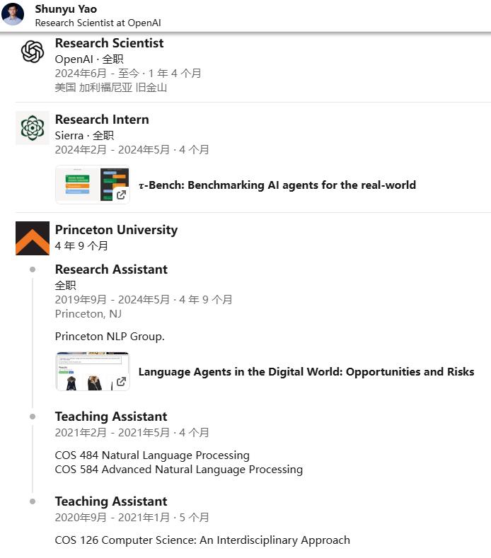 姚顺雨毕业于清华姚班,拥有普林斯顿大学计算机科学博士学位,于2024年8月加入OpenAI。